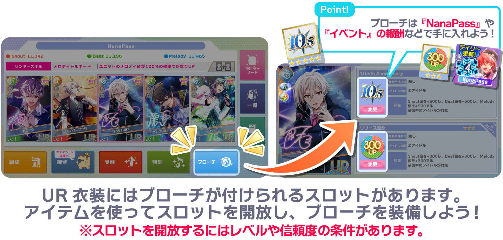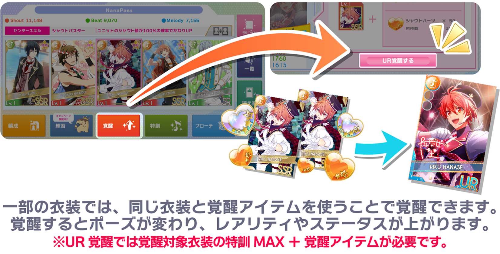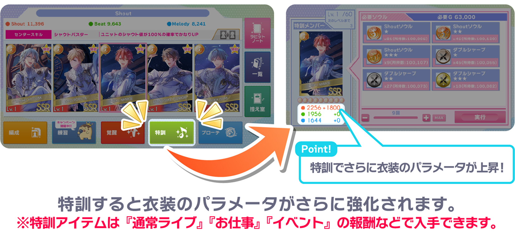 衣装を育成しよう!衣装は「練習」「特訓」「覚醒」を行ったり、「ブローチ」を装備したりすることでパラメータを上げることができます。それぞれに必要なアイテムは「イベント」や「お仕事」などの報酬で入手できます。練習をしてレベルを上げよう!特訓をしよう!覚醒をしよう!衣装にブローチを装備しよう!